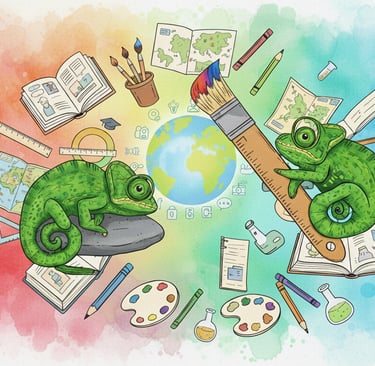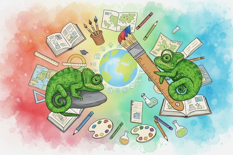Hermanos Camaleón nació con la ilusión de un circo de títeres en la calle. Aquella chispa creativa se transformó en un proyecto educativo que demuestra que todo puede convertirse en aprendizaje. Con el tiempo, los estudios en pedagogía, psicopedagogía, diseño gráfico y educación especial se unieron a la psicología y administración de los hermanos, formando un mosaico de talentos que se adapta como el camaleón a cada necesidad.